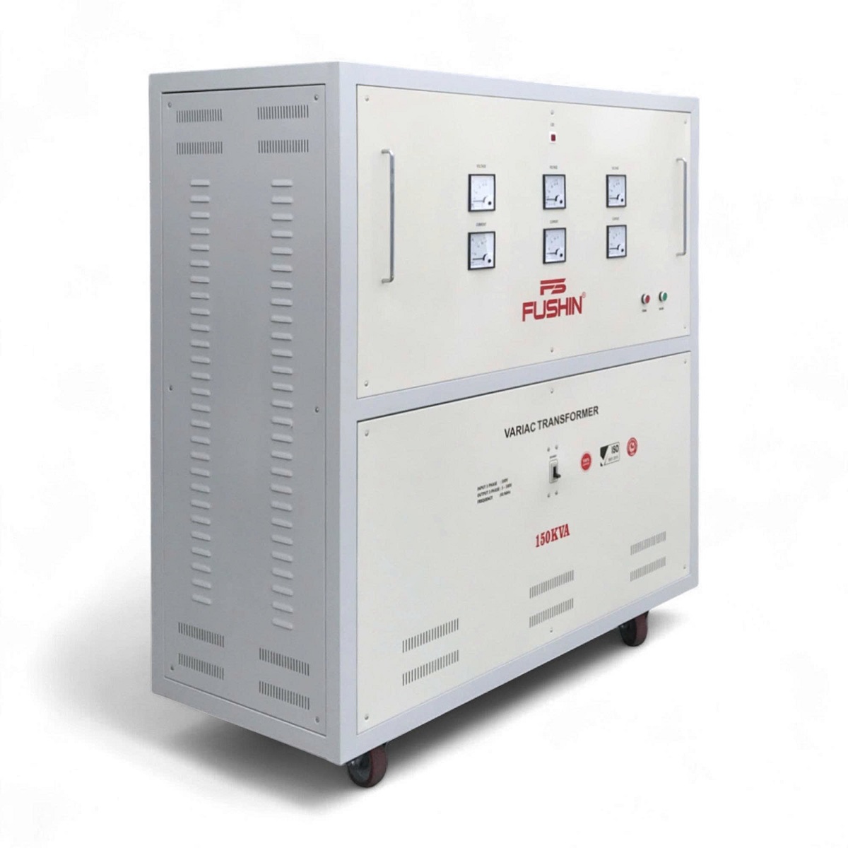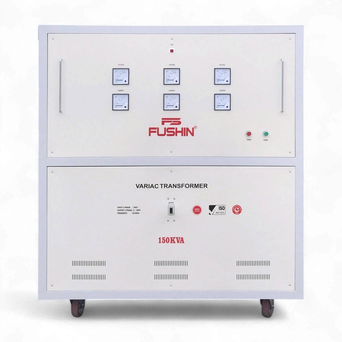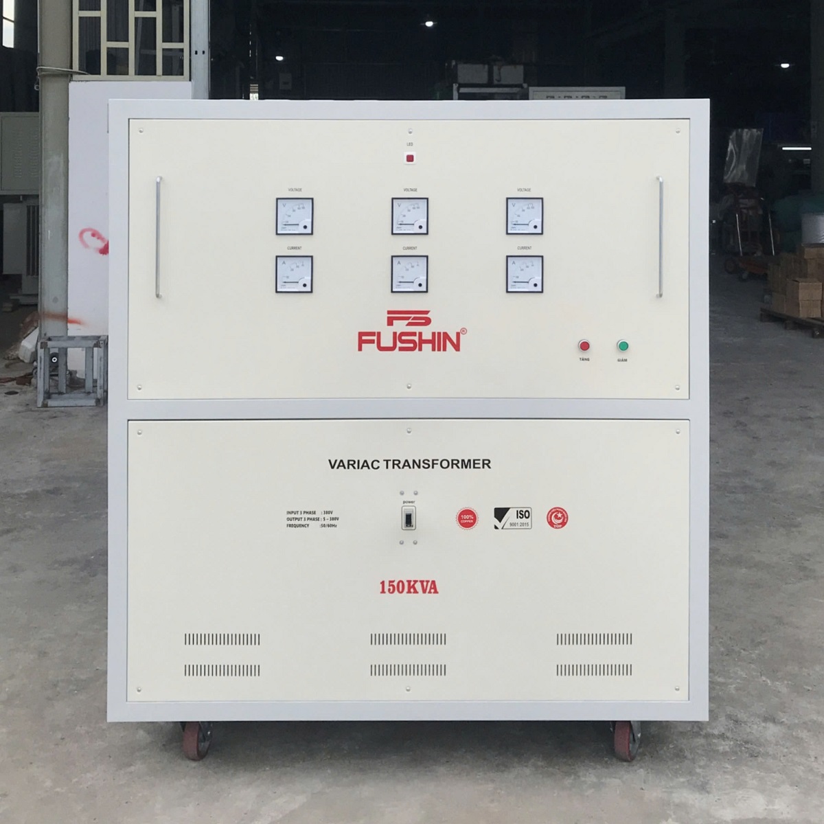 - Biến áp vô cấp (Variac Transformer) 3 pha thương hiệu Fushin là thiết bị có điện áp đầu vào 3 pha 380V thể điều chỉnh điện áp đầu ra liên tục trong một dải nhất định thường từ 5V đến 430V (hoặc theo yêu cầu sử dụng của khách hàng có thể thiết kế riêng).