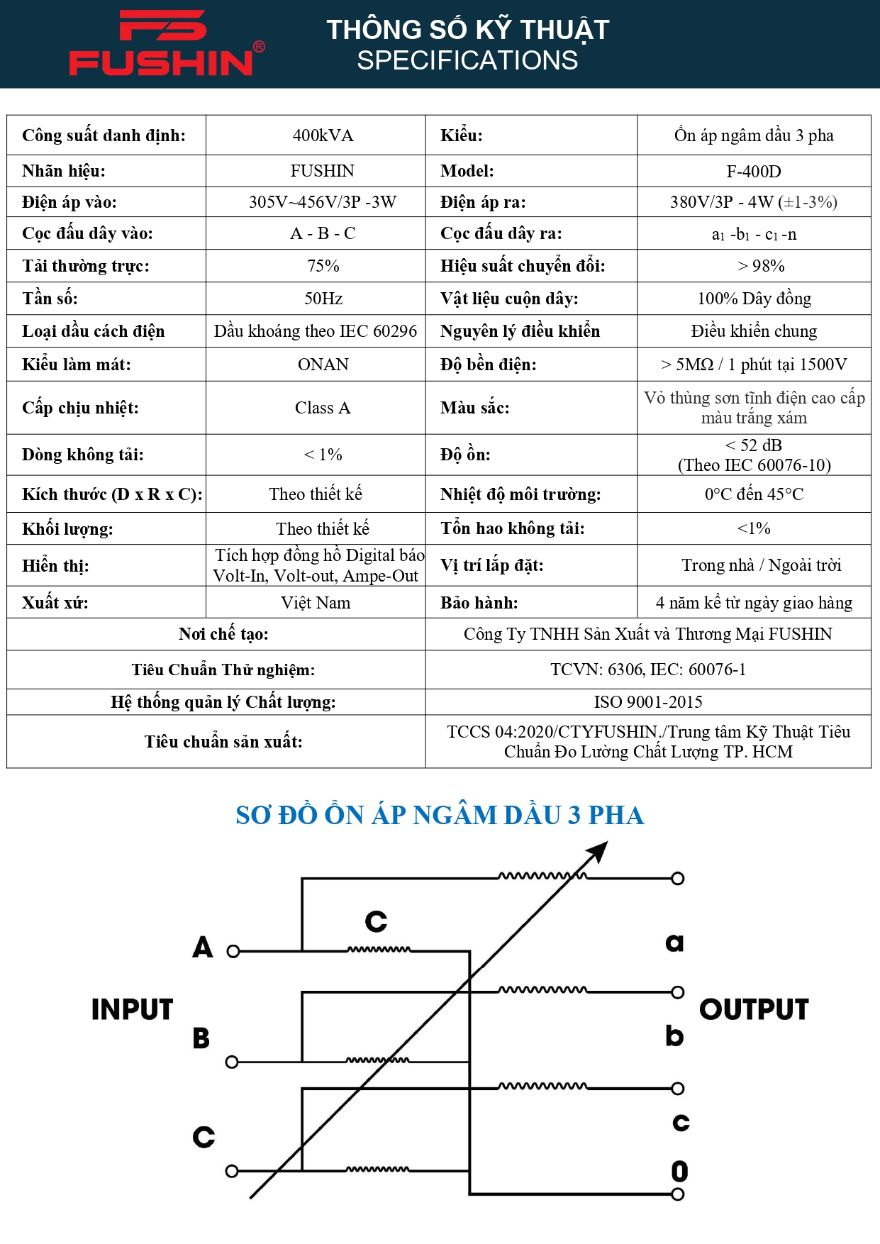 - Ổn áp ngâm dầu 3 pha Fushin là thiết bị ổn định điện áp 3 pha 380V được thiết kế đặc thù để hoạt động trong các môi trường khắc nghiệt nhà máy, xí nghiệp.
